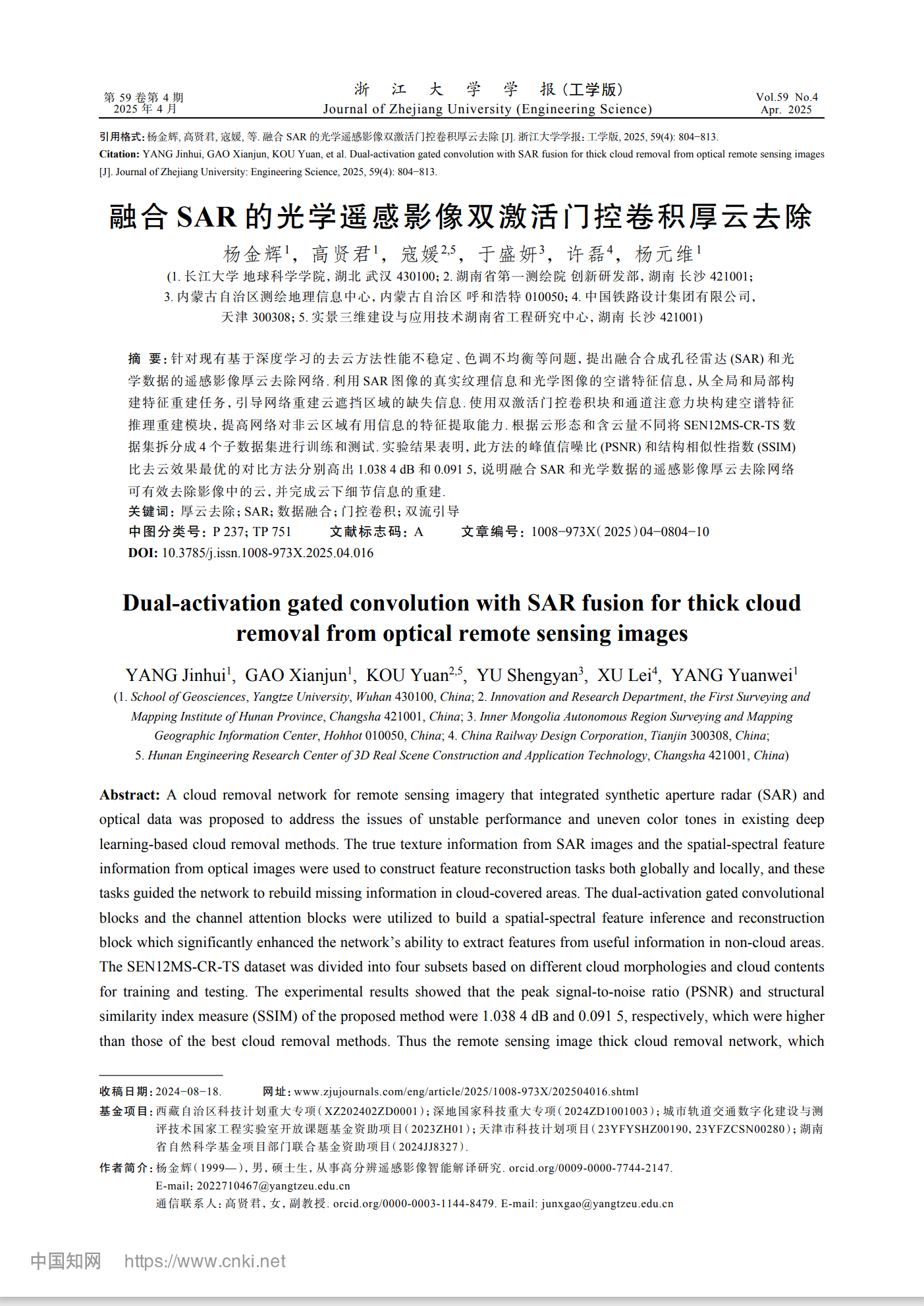 近日,金碧娱乐场 地图制图学与地理信息工程专业2022级研究生杨金辉在EI期刊《浙江大学学报(工学版)》发表题为“融合SAR的光学遥感影像双激活门控卷积厚云去除”的研究论文。金碧娱乐场 为论文第一署名单位,学生杨金辉为论文第一作者,其导师高贤君副教授为通讯作者。