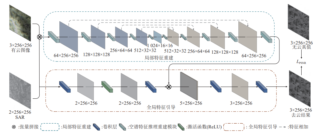 团队创新性地构建了"局部-全局"双驱动架构:一方面通过局部分支精准分离云区与非云区域特征,实现遮挡区域的层次化修复;另一方面引入SAR数据作为全局引导源,利用其穿透云层的物理特性为光学影像修复提供真实地理特征参照。核心技术突破体现在自主研发的"空谱特征推理模块",通过双激活门控卷积与通道注意力机制的结合,实现了像素级云区辨识与三维特征重建的协同优化。