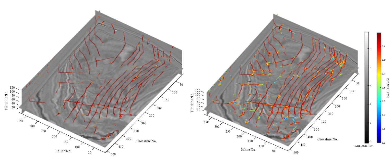 图2 基于不同深度网络模型的断层识别结果(空间,底图为地震数据)