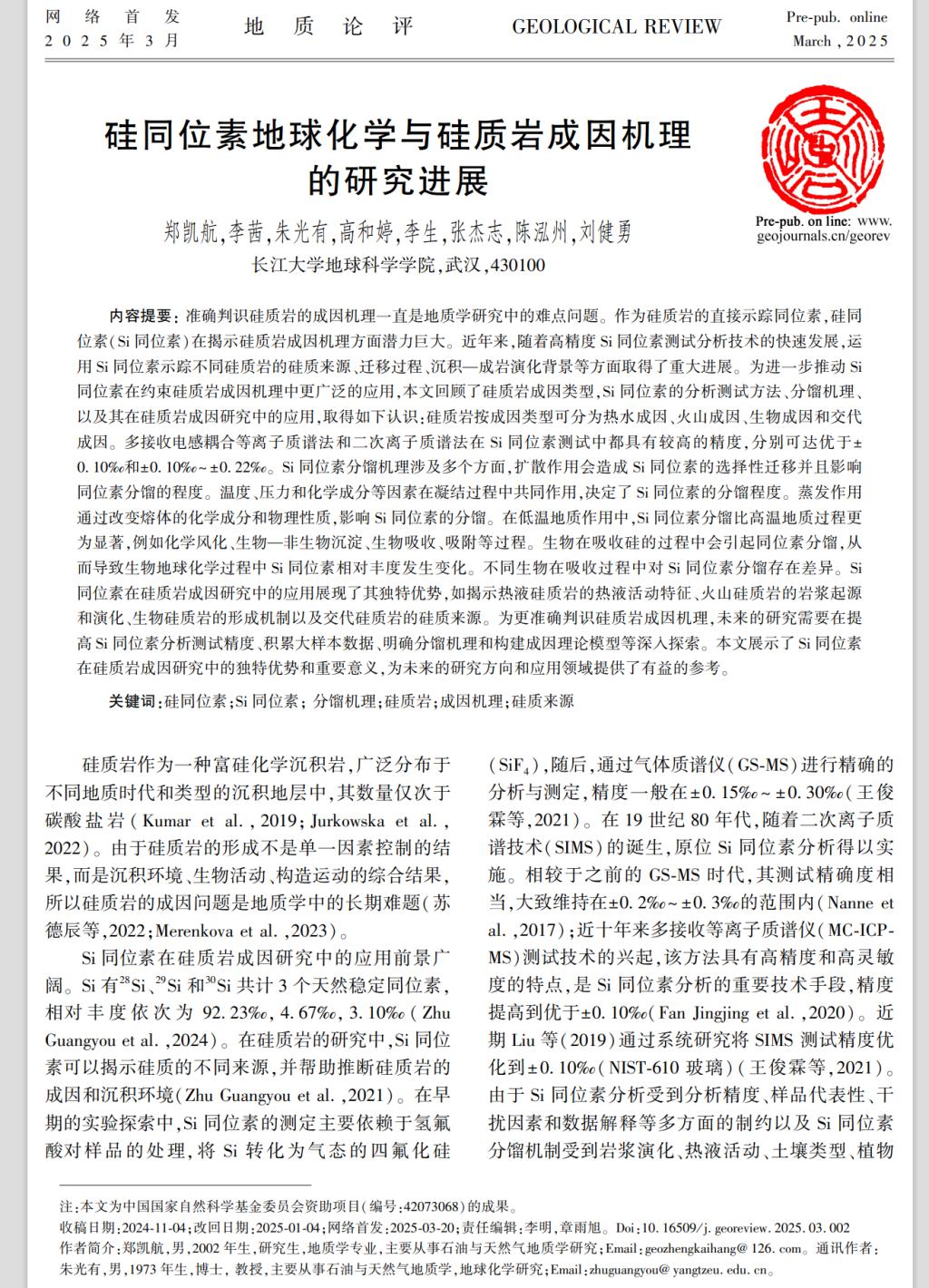 近日,金碧娱乐场 地质学专业2024级硕士生郑凯航在中文核心期刊《地质论评》发表题为“硅同位素地球化学与硅质岩成因机理的研究进展”的研究论文。金碧娱乐场 为论文第一署名单位,硕士生郑凯航为论文第一作者,其导师朱光有教授为通讯作者。