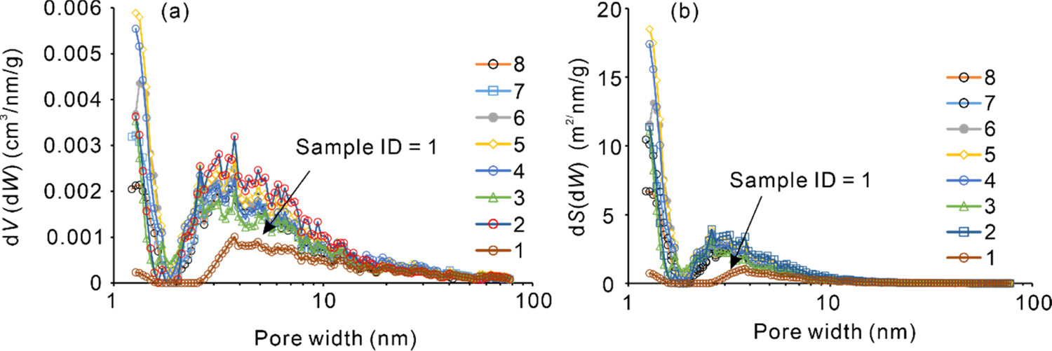 图3 从N2 吸附等温线获得的孔径分布。(a)孔体积分布与孔宽的关系。(b)孔SSA与孔宽的关系。dV/dW 和dS/dW 图均显示孔径的单峰分布。然而,样品1表现出不同的方式,孔宽变大,但孔体积和孔SSA变小。