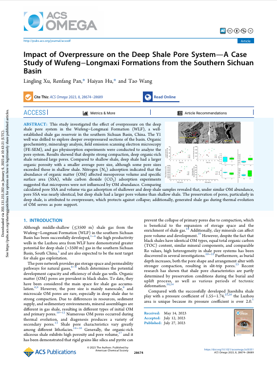 金碧娱乐场 石油系潘仁芳教授在地球化学领域主流期刊《ACS OMEGA》上发表题为“Impact of Over pressure on the Deep Shale Pore System—A Case Study of Wufeng−Longmaxi Formations from the Southern Sichuan Basin”的研究论文。