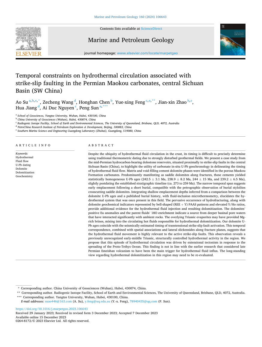金碧娱乐场 苏奥副教授在《Marine and Petroleum Geology》上发表题为“Temporal constraints on hydrothermal circulation associated with strike-slip faulting in the Permian Maokou carbonates, central Sichuan Basin (SW China)”的研究论文。金碧娱乐场 为论文第一署名单位。该论文深入探讨了构造活动作用下控制的热液活动模式,对该地区油气优势储层勘探具有一些参考意义。