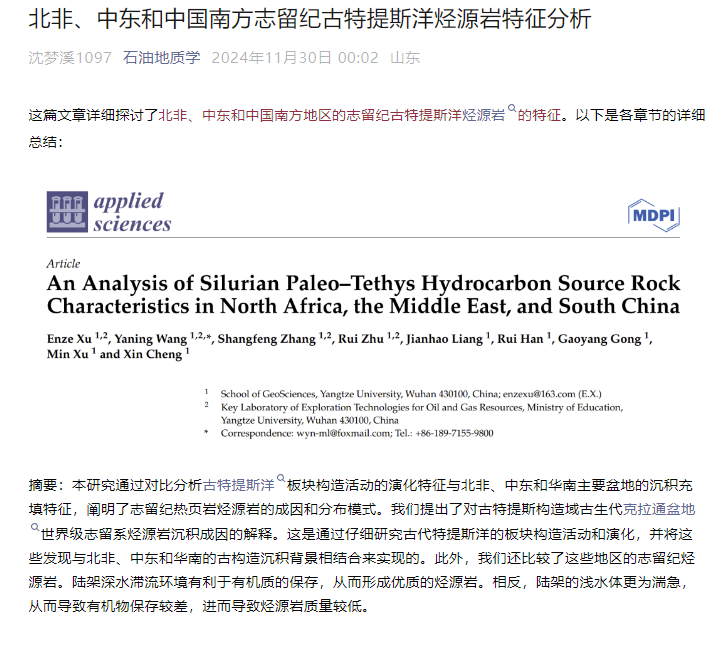 金碧娱乐场 博士研究生徐恩泽在Applied Sciences-Basel上发表论文研究北非、中东、华南三个地区志留系烃源岩特征