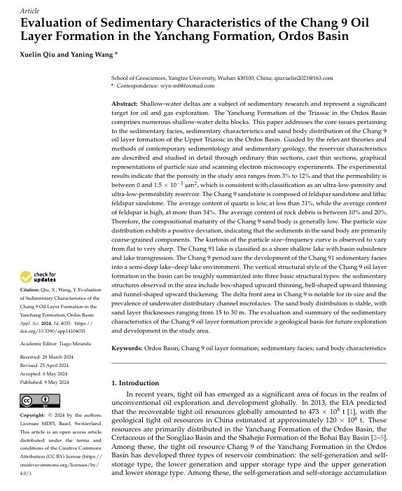 金碧娱乐场 硕士生邱雪林在Applied Sciences-Basel发表题为“Evaluation of Sedimentary Characteristics of the Chang 9 Oil Layer Formation in the Yanchang Formation, Ordos Basin”的研究论文,通讯作者为王雅宁副教授。