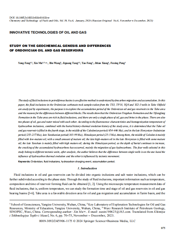 金碧娱乐场 研究生母鑫以长江大学为第一单位在《CHEMISTRY AND TECHNOLOGY OF FUELS AND OILS》期刊上发表论文奥陶系油气藏地球化学成因及差异性研究