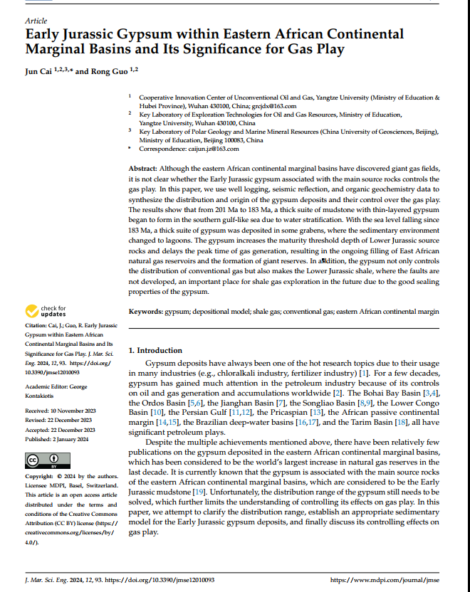 金碧娱乐场 蔡俊副教授在《JMSE》上发表题为“Early Jurassic Gypsum within Eastern African Continental Marginal Basins and Its Significance for Gas Play”的研究论文。该研究通过基于钻测井和地震资料,结合地球化学数据,分析了转换型陆缘盆地膏盐岩分布特征、成因及其对油气分布的控制作用。研究结果显示在陆间裂谷期的海平面上升阶段,由于水体较深出现盐度分层作用导致薄层膏盐岩析出;随着海平面下降,在地堑控制的洼地形成潟湖环境,蒸发作用的加剧导致了厚层膏盐岩的形成。膏盐岩的发育提升了前转换期烃源岩成熟的阈值,导致大规模生排烃的迟滞,这或许是转换陆缘盆地巨型油气藏形成的重要原因之一。