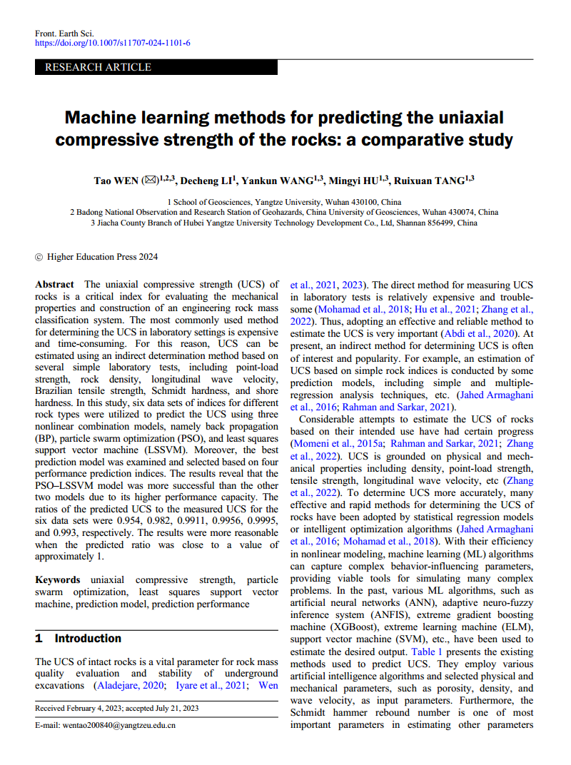 金碧娱乐场 温韬教授以第一作者身份在《Frontiers of Earth Science》上发表题为“Machine learning methods for predicting the uniaxial compressive strength of the rocks: a comparative study”的研究论文。金碧娱乐场 为论文第一署名单位。