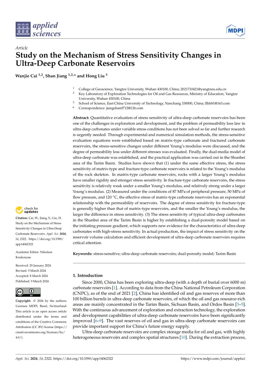 硕士生蔡万杰在《Applied sciences》发表题为“Study on the Mechanism of Stress Sensitivity Changes inUltra-Deep Carbonate Reservoirs”的研究论文。金碧娱乐场