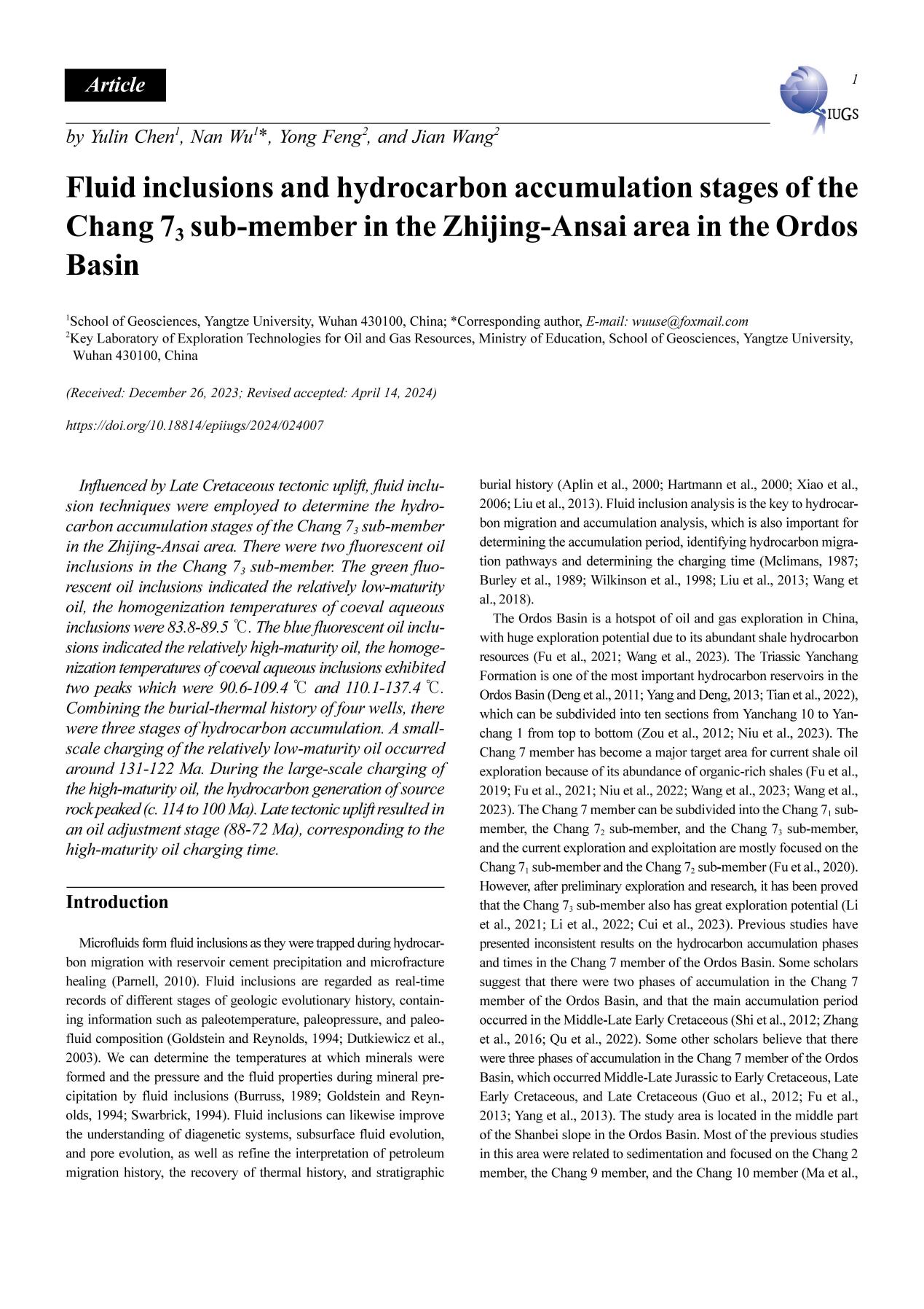 硕士生陈雨霖在《EPISODES》上发表题为“Fluid inclusions and hydrocarbon accumulation stages of the Chang 73 sub-member in the Zhijing-Ansai area in the Ordos Basin”的研究论文。金碧娱乐场