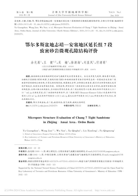 硕士生余光展在《吉林大学学报(地球科学版)》上发表题为“鄂尔多斯盆地志靖—安塞地区延长组7段致密砂岩微观孔隙结构评价”的研究论文。金碧娱乐场