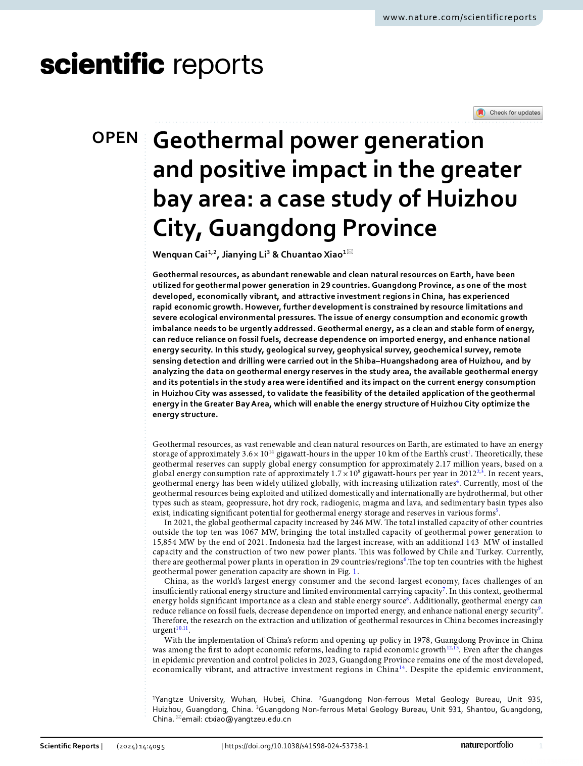 金碧娱乐场 地质学专业硕士生蔡文权在国际综合类科技期刊《Scientific Reports》上发表题为“Geothermal power generation and positive impact in the greater bay area: a case study of Huizhou City, Guangdong Province”的研究论文。金碧娱乐场 为论文第一署名单位,硕士研究生蔡文权为论文第一作者,其导师肖传桃教授为该文通讯作者。