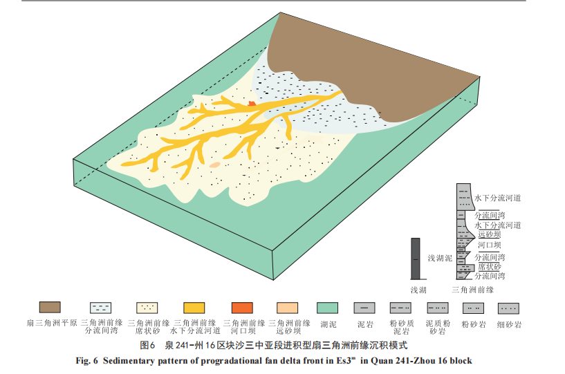 基于渤海湾盆地廊固凹陷泉241-州16区块沙三中亚段属于扇三角洲前缘亚相沉积,发育水下分流河道、分流间湾、河口坝、远砂坝及席状砂 5 种微相类型。整体上表现为湖退进积的沉积过程,水下分流河道为最主要的沉积类型,在平面上呈北西—南东向辫状分布。泉241-州 16 区块沙三中亚段沉积物源来自西北方向,大兴断裂的活动导致西北部地层抬升形成区域隆起带,为湖盆提供充分的沉积物源。砂体在平面上呈现由近源到远源逐渐减薄的分布特点。建立了泉 241-州 16 区块浅水进积型扇三角洲前缘的沉积模式,沙三中亚段分流河道在研究区的发育达到顶点,砂体由湖盆边缘向中心推进时,河道频繁分汊交汇,河道宽度逐渐变窄,砂层变细变薄,河道周围的席状砂与分流河道共同形成了扇三角洲前缘沉积体系的骨架。