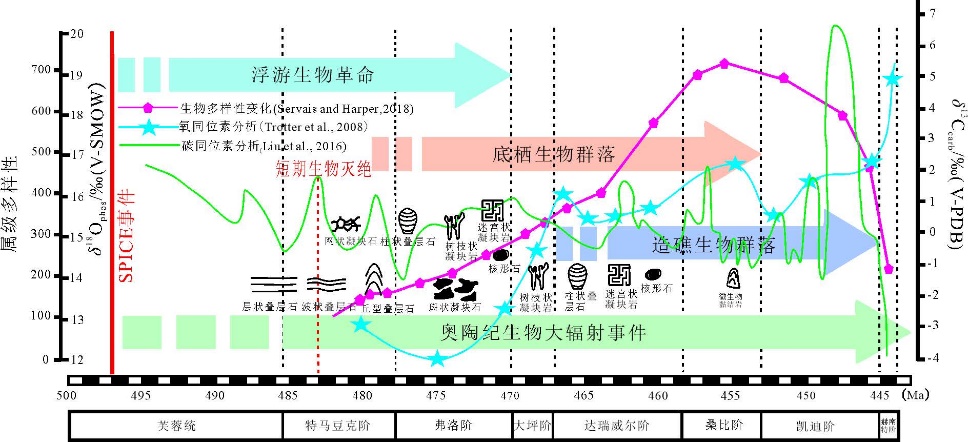 图3 奥陶纪生物大辐射事件数据显示的属级多样性趋势、微生物岩类型变化及δ13Ccarb和δ18Ophos分析图(修改自Servais and Harper,2018)