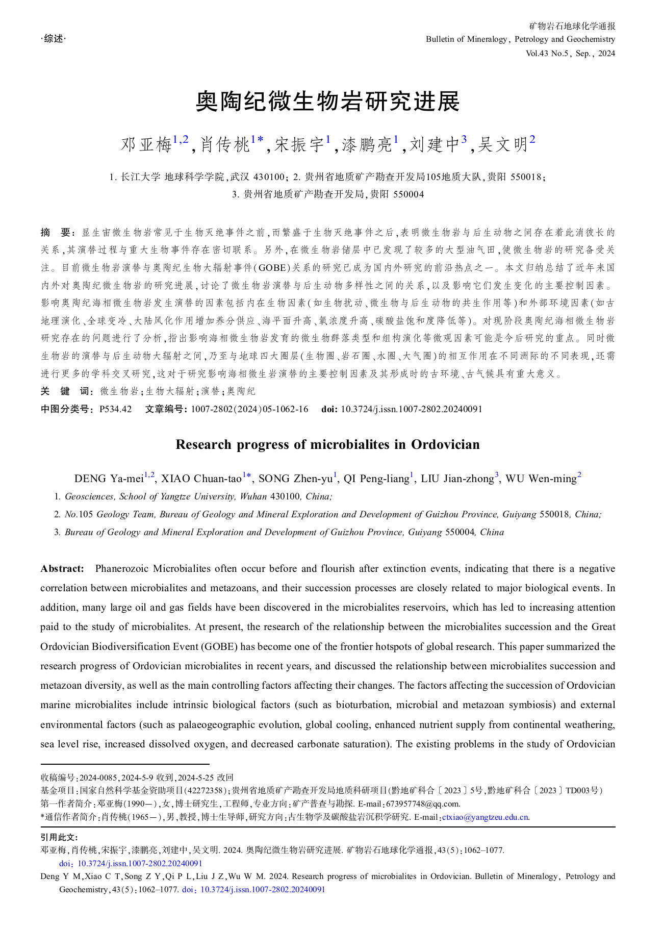 肖传桃教授的指导下,在地球科学与地质学领域期刊《矿物岩石地球化学通报》上发表题为“奥陶纪微生物岩研究进展”的研究论文。