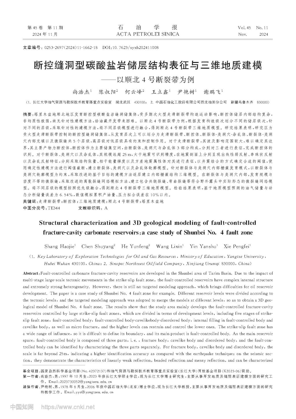 博士生尚浩杰在期刊《石油学报》上发表题为“断控缝洞型碳酸盐岩储层结构表征与三维地质建模-以顺北4号断裂带为例”的研究论文。长江大学油气资源与勘探技术教育部重点实验室为论文第一署名单位,尹艳树教授为通讯作者,本项研究得到国家自然科学基金项目、油气资源与勘探技术教育部重点实验室(长江大学)开放基金项目共同资助。