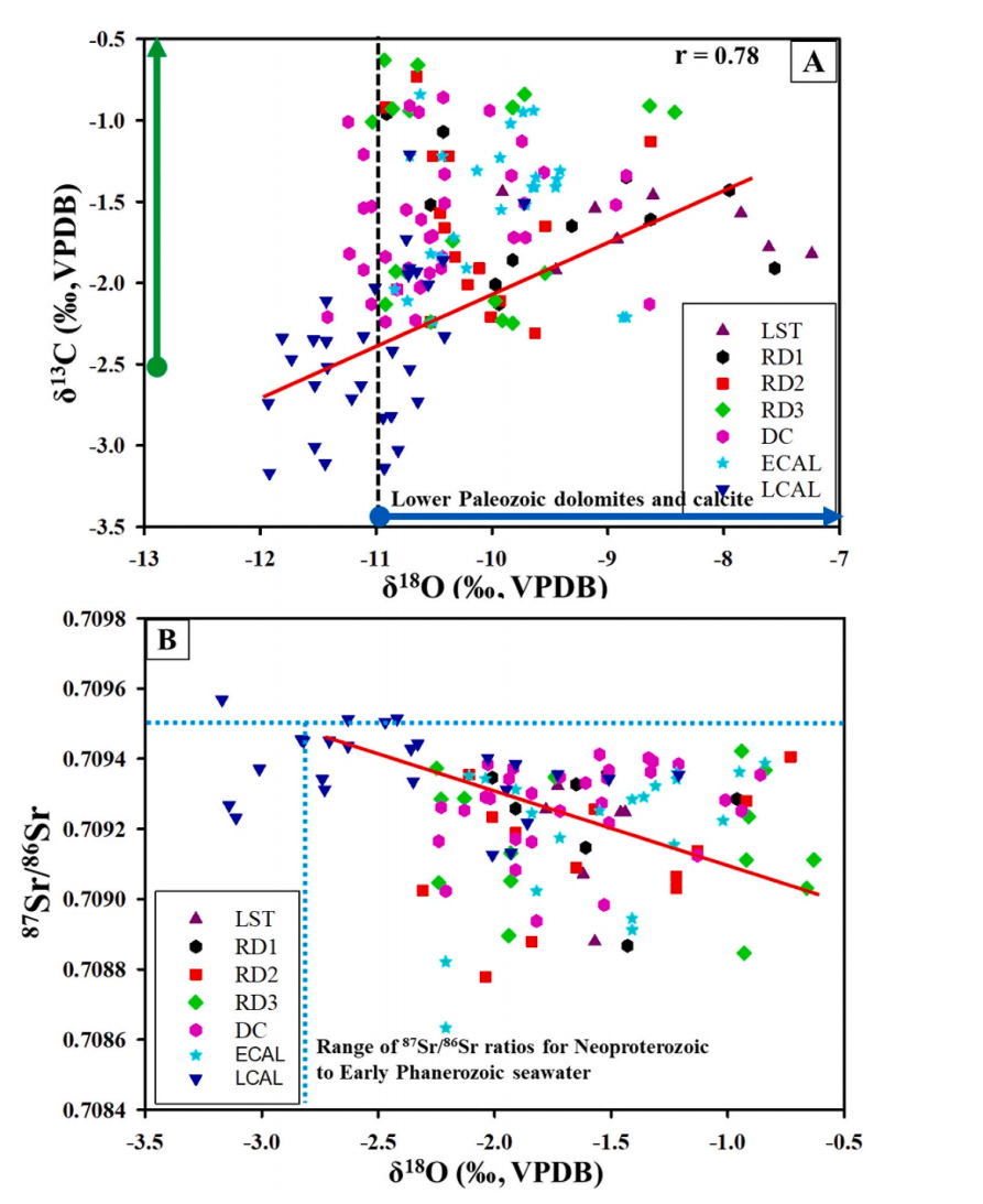 白云岩记录了从寒武纪到奥陶纪之间沉积环境和海平面变化的信息。近地表、浅层以及深埋地下都存在着不同阶段的成岩作用,并且每一个阶段会对所包含碳酸盐岩样本中的稳定同位素比率产生特定影响。通过不同类型白云岩,如混合层白云岩和等量晶粒白云岩与原始泥灰质碳酸盐进行δ13C值比较,提出了有关流体来源和特性的假设(图1)。在脱镁过程中碳酸盐流体系统显示了O-C同位素组成上的负漂移,并且具有高Mg/Ca比例。可以使用稀土元素模式(RD1, RD2, RD3)来区别不同类型的碳酸盐沉积物。通过对比δ13C、δ18O、87Sr/86Sr等不同同位素比值,可以推断出古代海洋中存在不同深度水体交换,并伴随有显著溶解、重结晶作用。本研究将提高裂缝在油气成藏中的地位,并为今后研究区的构造演化研究提供依据,对塔中隆起的油气勘探具有重要意义。