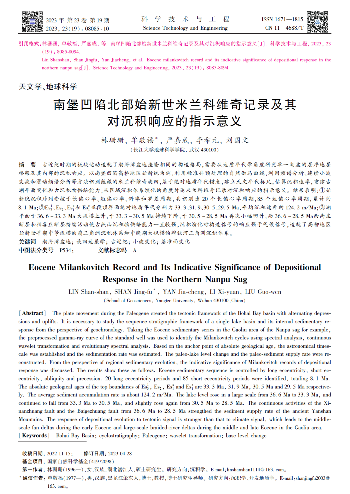 硕士生林珊珊在《科学技术与工程》发表题为“南堡凹陷北部始新世米兰科维奇记录及其对沉积响应的指示意义”的研究论文。金碧娱乐场