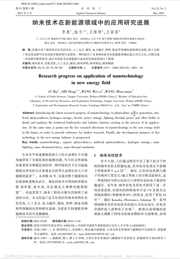 硕士生李惠在中文期刊《应用化工》上发表了题为“纳米技术在新能源领域中的应用研究进展”的研究论文。金碧娱乐场