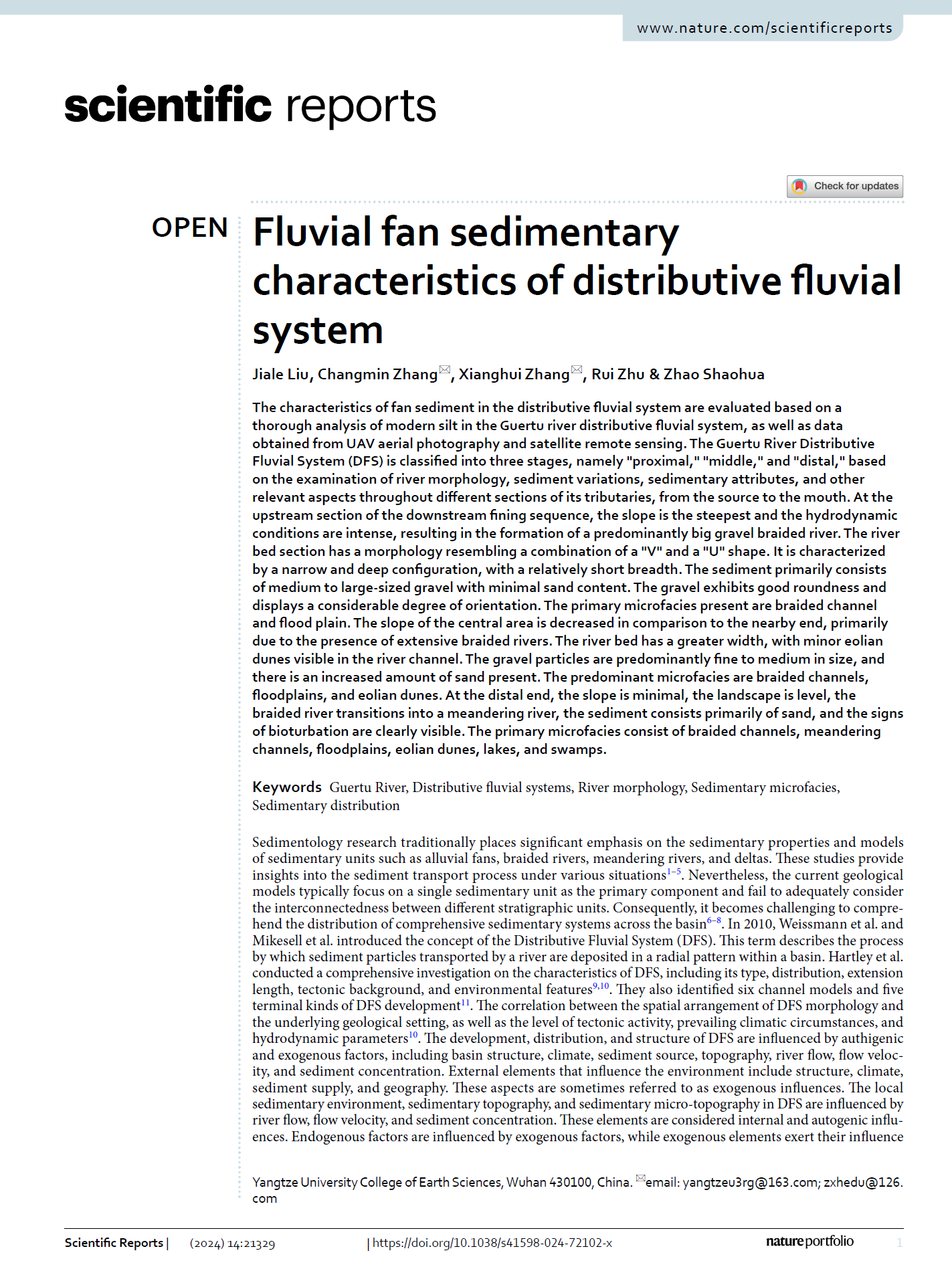 金碧娱乐场 博士生刘家乐在期刊《scientific reports》上发表题为“Fluvial fan sedimentary characteristics of distributive fluvial system”的研究论文。金碧娱乐场 为论文第一署名单位,张昌民教授、张祥辉博士为共同通讯作者,本项研究得到国家自然科学基金重点项目、湖北省自然科学基金项目共同资助。