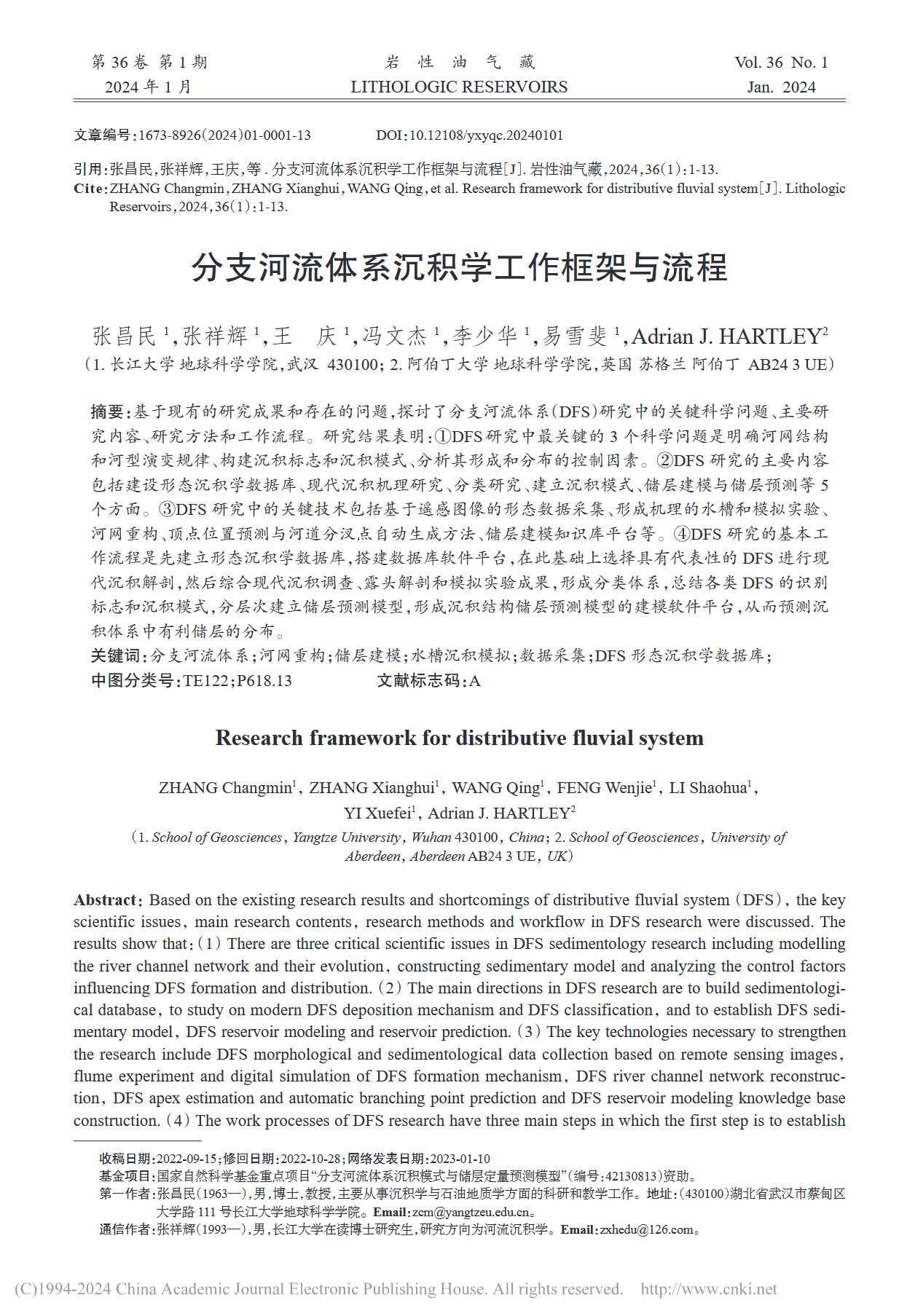 论文研究结果表明:(1)DFS研究中最关键的3个科学问题是明确河网结构和河型演变规律、构建沉积标志和沉积模式、分析其形成和分布的控制因素。(2)DFS研究的主要内容包括建设形态沉积学数据库、现代沉积机理研究、分类研究、建立沉积模式、储层建模与储层预测等5个方面。(3)DFS研究中的关键技术包括基于遥感图像的形态数据采集、形成机理的水槽和模拟实验、河网重构、顶点位置预测与河道分汊点自动生成方法、储层建模知识库平台等。(4)DFS研究的基本工作流程是先建立形态沉积学数据库,搭建数据库软件平台,在此基础上选择具有代表性的DFS进行现代沉积解剖,然后综合现代沉积调查、露头解剖和模拟实验成果,形成分类体系,总结各类DFS的识别标志和沉积模式,分层次建立储层预测模型,形成沉积结构储层预测模型的建模软件平台,从而预测沉积体系中有利储层的分布。