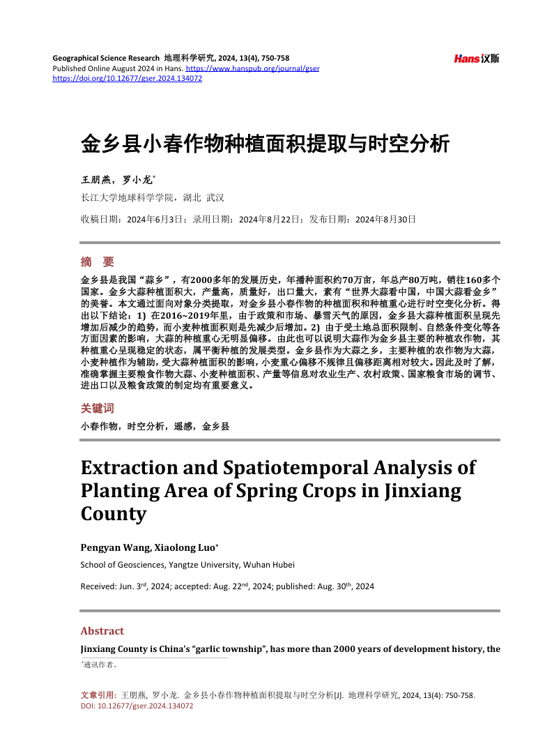 硕士生王鹏燕在中文期刊《地理科学研究》上发表了题为“金乡县小春作物种植面积提取与时空分析”的研究论文。金碧娱乐场