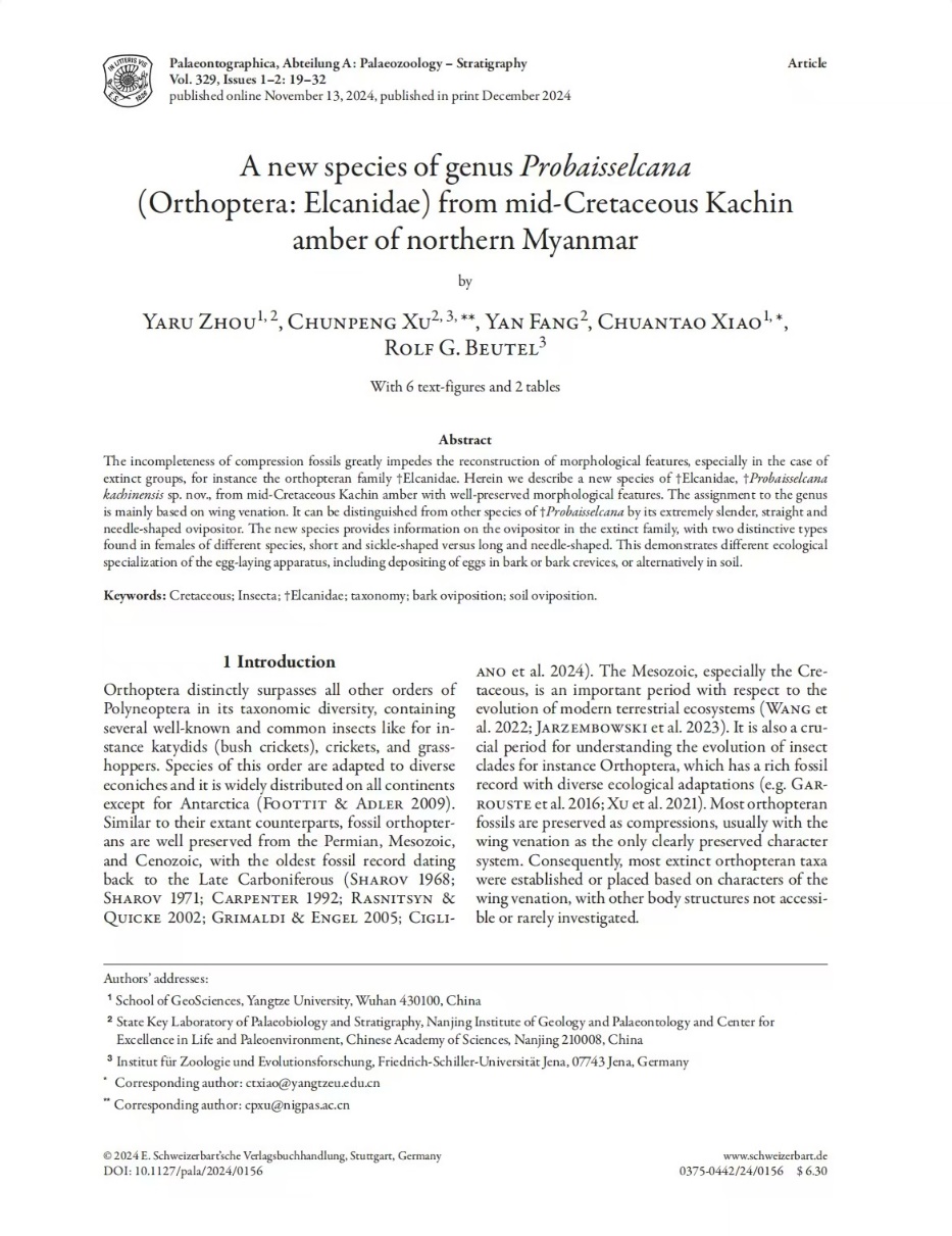 地质学专业硕士研究生周雅茹在肖传桃教授、南京地质古生物研究所的许春鹏博士的共同指导下,在地球科学与古生物学领域期刊《PalaeontographicaAbteilungA》上发表题为“Anew species of genusProbaisselcana (Orthoptera:Elcanidae) from mid-Cretaceous Kachin amber of northern Myanmar”的研究论文。