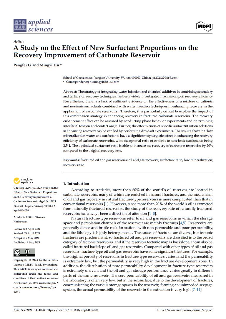 2021级硕士生李鹏飞在期刊《Applied Sciences》上发表了题为“A Study on the Effect of New Surfactant Proportions on the Recovery Improvement of Carbonate Reservoir”的研究论文。金碧娱乐场