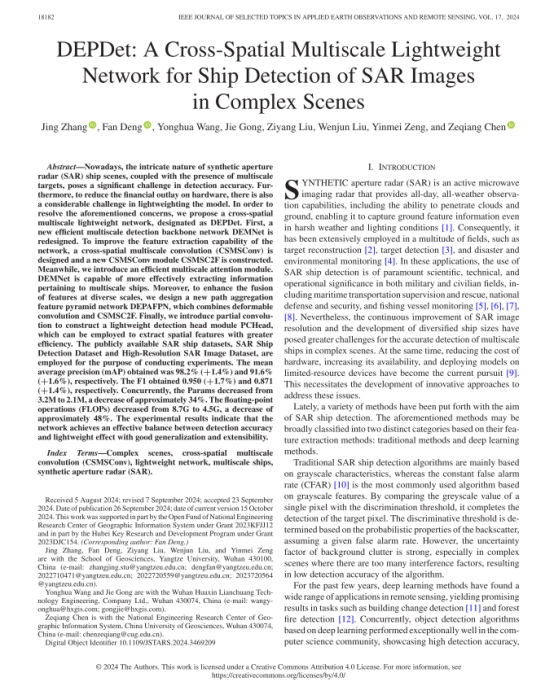 硕士生张晶在地球科学2区TOP期刊《IEEE JOURNAL OF SELECTED TOPICS IN APPLIED EARTH OBSERVATIONS AND REMOTE SENSING》发表题目为“DEPDet: A Cross-Spatial Multiscale Lightweight Network for Ship Detection of SAR Images in Complex Scenes”的研究论文。金碧娱乐场