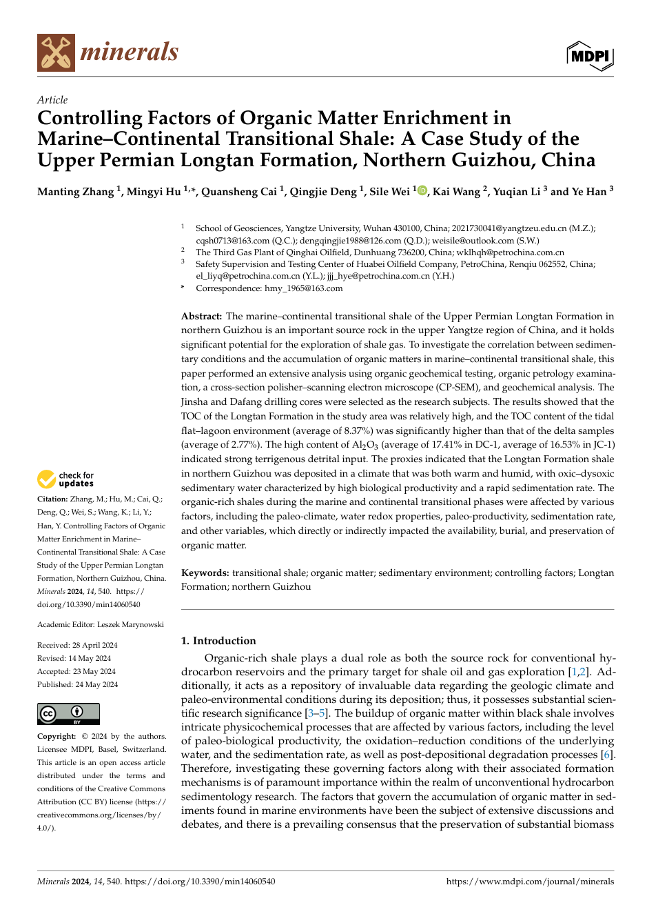 地质系胡明毅教授团队长期从事储层沉积学及页岩气资源评价等方向的研究。团队成员张曼婷博士在期刊《Minerals》上发表题为《Controlling Factors of Organic Matter Enrichment in Marine–Continental Transitional Shale: A Case Study of the Upper Permian Longtan Formation, Northern Guizhou, China》的研究论文,金碧娱乐场