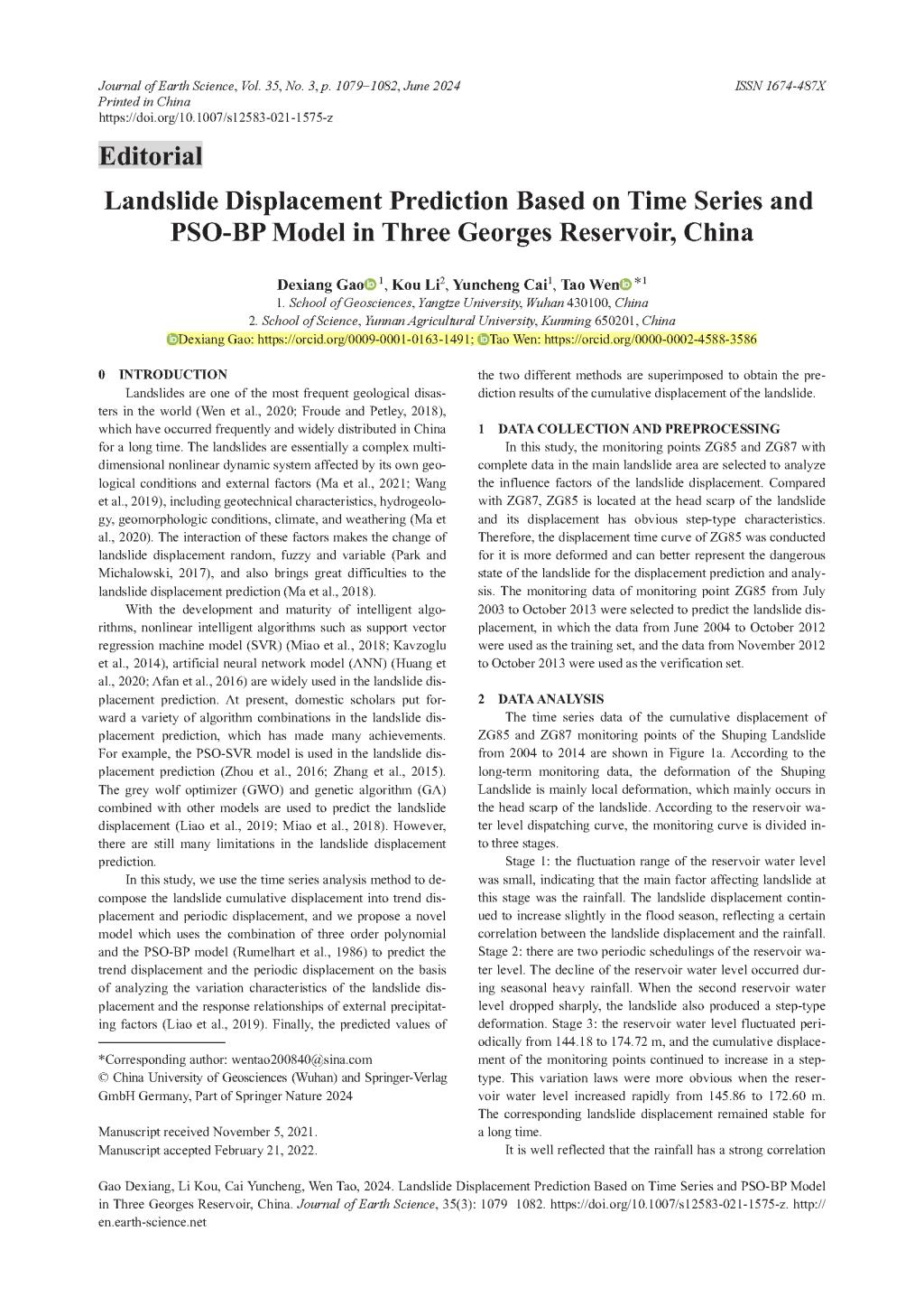 金碧娱乐场 本科生高德祥在SCI2区期刊《Journal of Earth Science》上发表论文,介绍基于时间序列的PSO-BP三峡库区滑坡位移预测模型