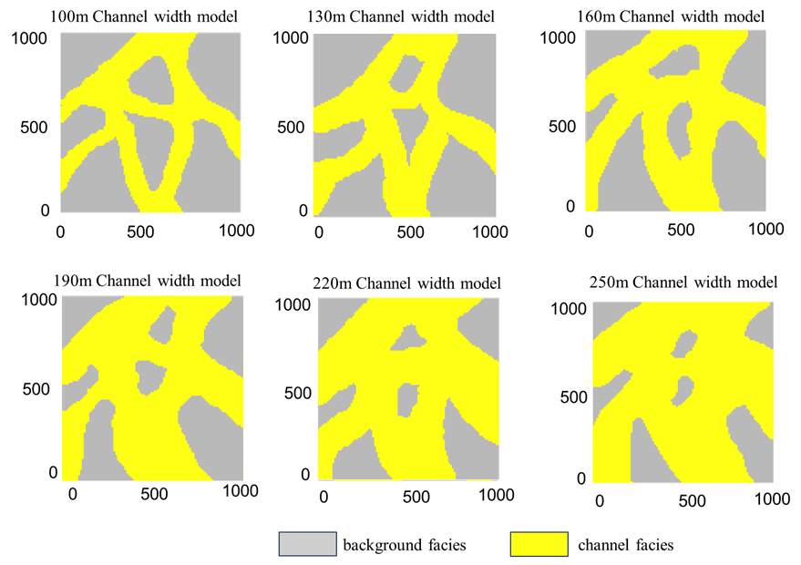研究以准噶尔盆地腹部古尔班通古特沙漠北部L油田为试验区,根据区块沉积背景以及现代沉积研究,采用基于目标模拟与人机交互的方法建立了不同河道宽度的水下分流河道候选模型(图1),运用基于深度卷积神经网络进行河道宽度模型优选,结果表明,当水下分流河道宽度为230m时与条件数据匹配率最高,与实际情况相符,可以确定其为研究区内水下分流河道的常见宽度。通过对水下分流河道宽度进行定量分析,为储层精细非均质性研究提供了基础,对根据井点数据反推实际工区的河道砂体宽度以及分布特征具有实际意义,也为多点地质统计学随机建模提供了依据。