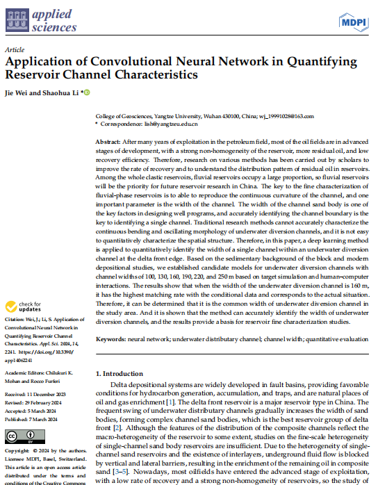 该研究运用深度学习对三角洲前缘水下分流河道内单一河道宽度进行定量识别。为了解剩余油的分布情况,需要从识别单一河道入手,逐步解剖分析复合河道砂体的非均质性,从而提高开采效率。河道砂体的宽度是设计井位布置方案的关键因素之一,并且识别单一河道的关键是能准确识别河道边界。因此想要识别单一河道,必须确定河道宽度。该研究基于深度卷积神经网络提出一种河道宽度模型优选方法,在确定河道砂体宽度应用中表现出良好的识别性能,对根据井点数据反推实际工区的河道砂体宽度以及分布特征具有实际意义。