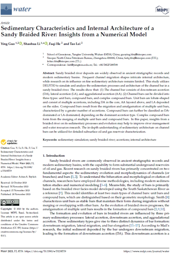 金碧娱乐场 郭颖博士在期刊《Water》上发表题为“Sedimentary Characteristics and Internal Architecture of a Sandy Braided River: Insights from a Numerical Model”的研究论文。金碧娱乐场 为论文第一署名单位,郭颖博士为第一作者,其导师李少华教授为该文通讯作者。
