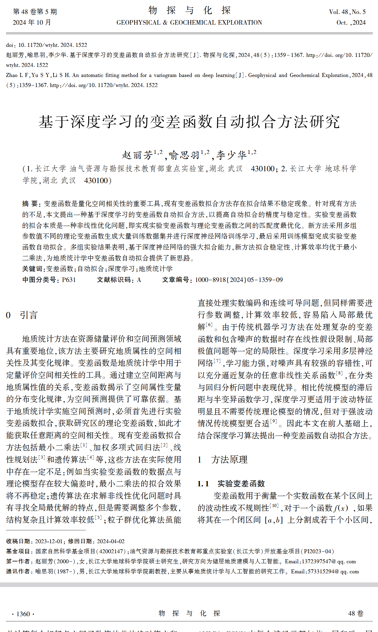 金碧娱乐场 研究生赵丽芳在《物探与化探》上发表论文介绍深度学习在变差函数自动拟合上应用的研究