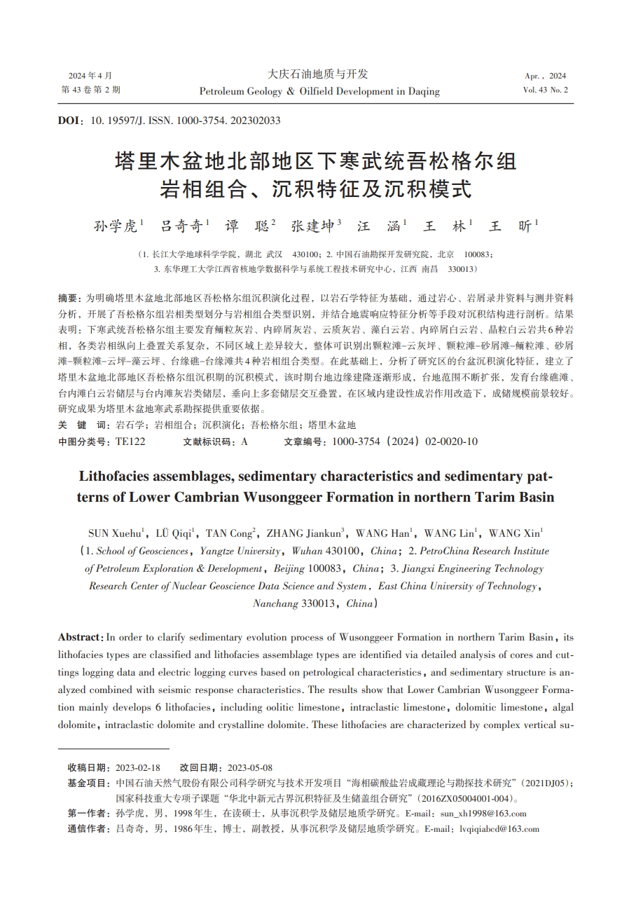 金碧娱乐场 硕士生孙学虎在《大庆石油地质与开发》上发表了题为“塔里木盆地北部地区下寒武统吾松格尔组岩相组合、沉积特征及沉积模式”的研究论文,采用岩相学、沉积学的方法,分析了塔北地区下寒武统吾松格尔组沉积特征演化过程。长江大学为论文第一署名单位,孙学虎为第一作者,导师吕奇奇副教授为通讯作者。