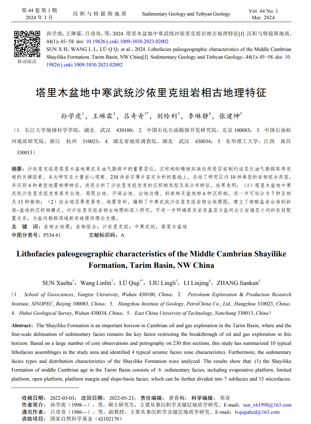 硕士生孙学虎在《沉积与特提斯地质》上发表了题为“塔里木盆地中寒武统沙依里克组岩相古地理特征”的研究论文,采用岩相学、沉积学的方法,分析了塔塔里木盆地沙依里克组岩相古地理过程。长江大学为论文第一署名单位,孙学虎为第一作者,导师吕奇奇副教授为通讯作者。