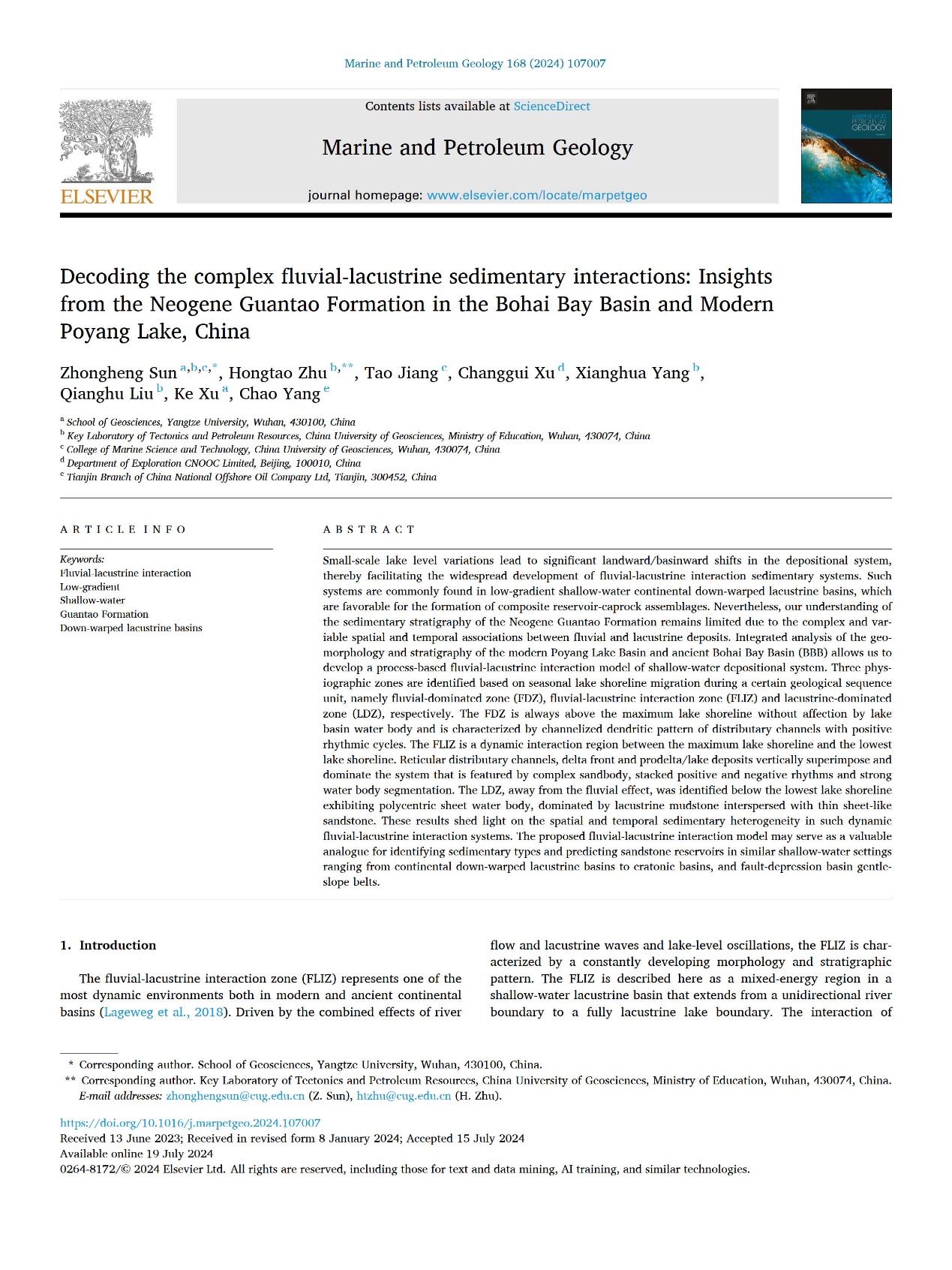 金碧娱乐场 教师孙中恒博士以第一作者身份在石油地质领域主流期刊《Marine and Petroleum Geology》以“Decoding the complex fluvial-lacustrine sedimentary interactions: Insights from the NeogeneGuantaoFormation in the Bohai Bay Basin and Modern Poyang Lake, China”为题发表论文,该项研究得到了国家自然科学基金项目和博士后面上项目的资助。