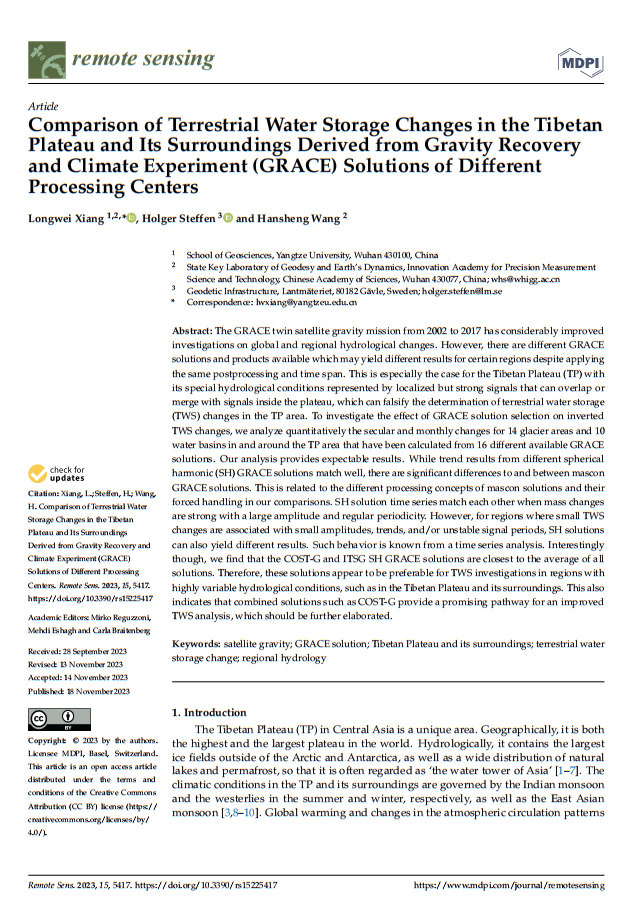 金碧娱乐场 教师相龙伟博士在《REMOTE SENSING》期刊发表论文揭示不同数据中心解算GRACE卫星重力数据对应青藏高原TWSC结果有差异