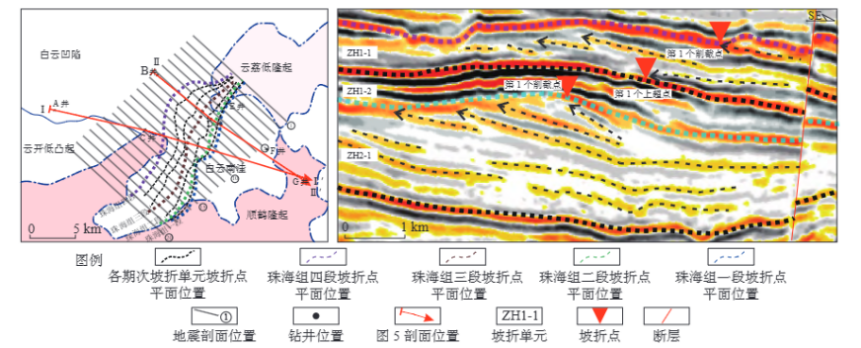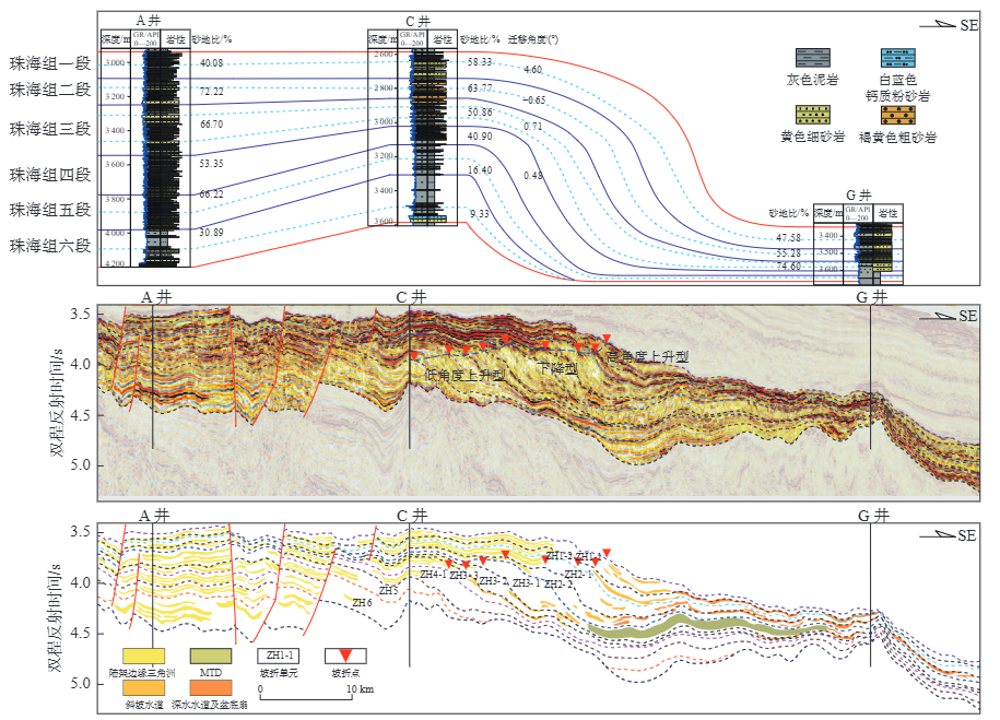 图2珠海组四-一段低角度上升型—高角度上升型—下降型—高角度上升型坡折演化