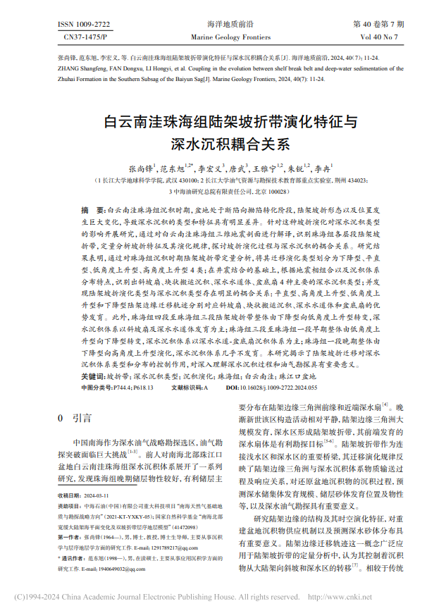 张尚锋教授在《海洋地质前沿》期刊发表题目为“白云南洼珠海组陆架坡折带演化特征与深水沉积耦合关系”的研究论文。