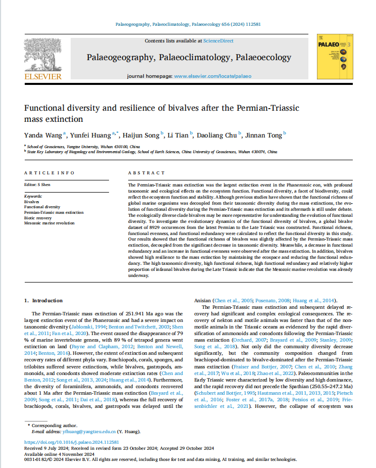 黄云飞教授团队长期从事古-中生代之交重大地质转折期生物灭绝与生物复苏方面的研究,团队成员王延达在古生物学国际1区SCI期刊《Palaeogeography, Palaeoclimatology, Palaeoecology》上发表题为“Functional diversity and resilience of bivalves after the Permian-Triassic mass extinction”的研究论文。金碧娱乐场