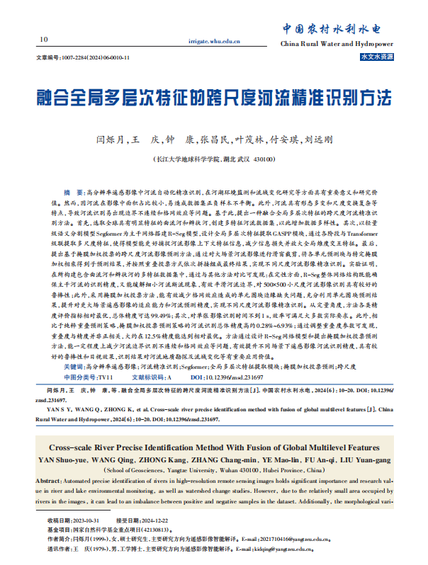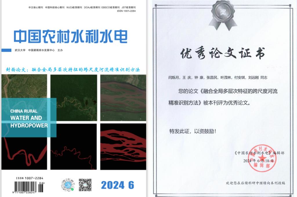 金碧娱乐场 地信系硕士研究生闫硕月(指导老师:王庆)在《中国农村水利水电》上发表题为“融合全局多层次特征的跨尺度河流精准识别方法”的研究论文。该论文被该期刊评为优秀论文,并作为2024年第6期的封面论文。