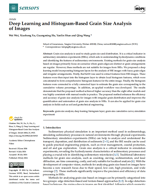 魏薇博士在国际学术期刊《Sensors》上发表了题为“Deep Learning and Histogram-Based Grain Size Analysis of Images”的SCI论文,提出了一种创新的基于深度学习和直方图分析的图像粒度识别方法。该研究不仅在理论上具有创新性,而且在实际应用中展现了显著的效率与准确性,为沉积模拟实验中的粒度分析提供了新的技术路径。