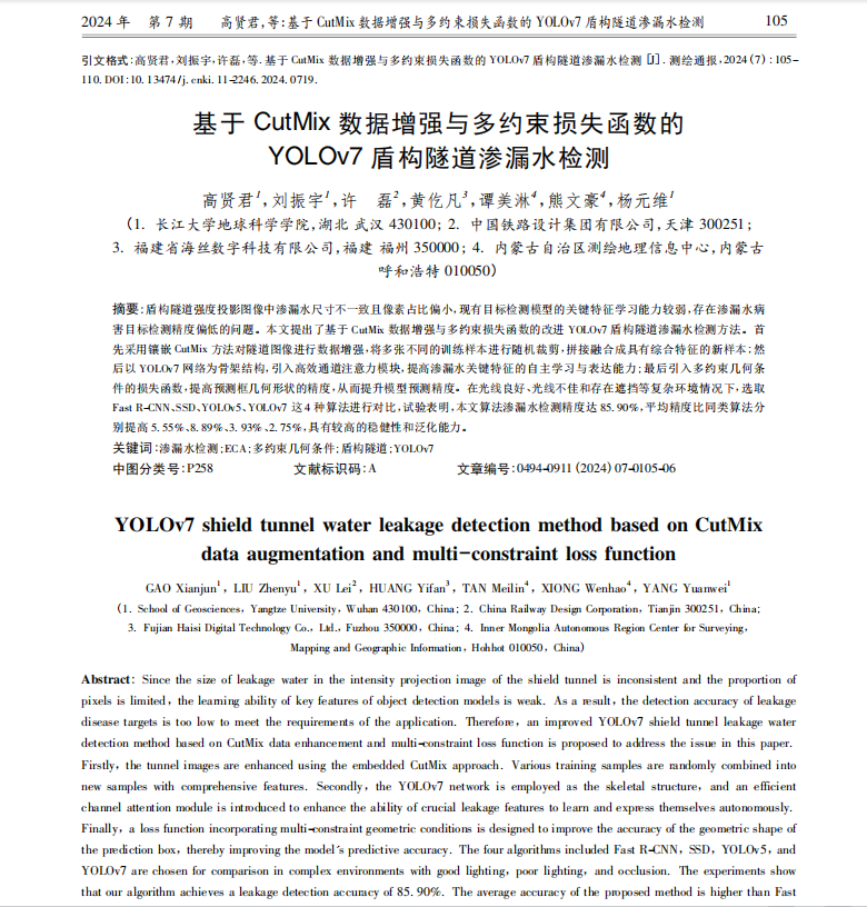 金碧娱乐场 地信系高贤君老师在测绘领域主流期刊《测绘通报》上发表题为“基于Cutmix数据增强与多约束损失函数的YOLOv7盾构隧道渗漏水检测”的研究论文。