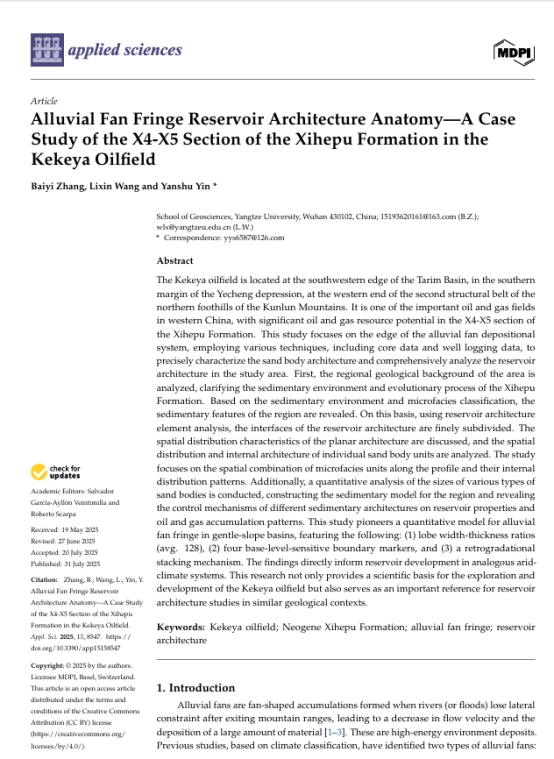 硕士生张佰义在SCI收录期刊《Applied Sciences》上发表题为“Alluvial Fan Fringe Reservoir Architecture Anatomy — A Case Study of the X4-X5 Section of the Xihepu Formation in the Kekeya Oilfield”的研究论文。金碧娱乐场