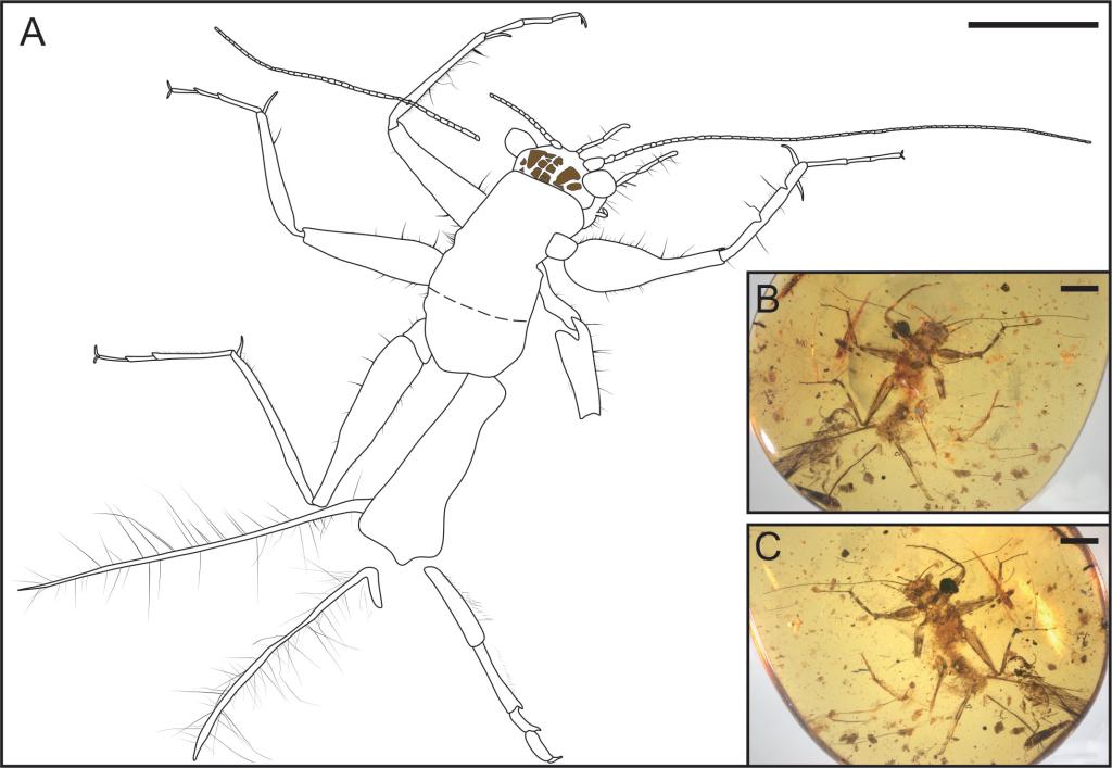 蟋蟀类是直翅目昆虫中物种多样性最丰富的类群之一,但其化石记录在白垩纪-古近纪灭绝事件前较为稀少,多为翅部印痕化石为主,限制了演化研究。形成于白垩纪中期的克钦琥珀,因能精细保存生物软组织,成为研究中生代昆虫演化的“天然博物馆”。