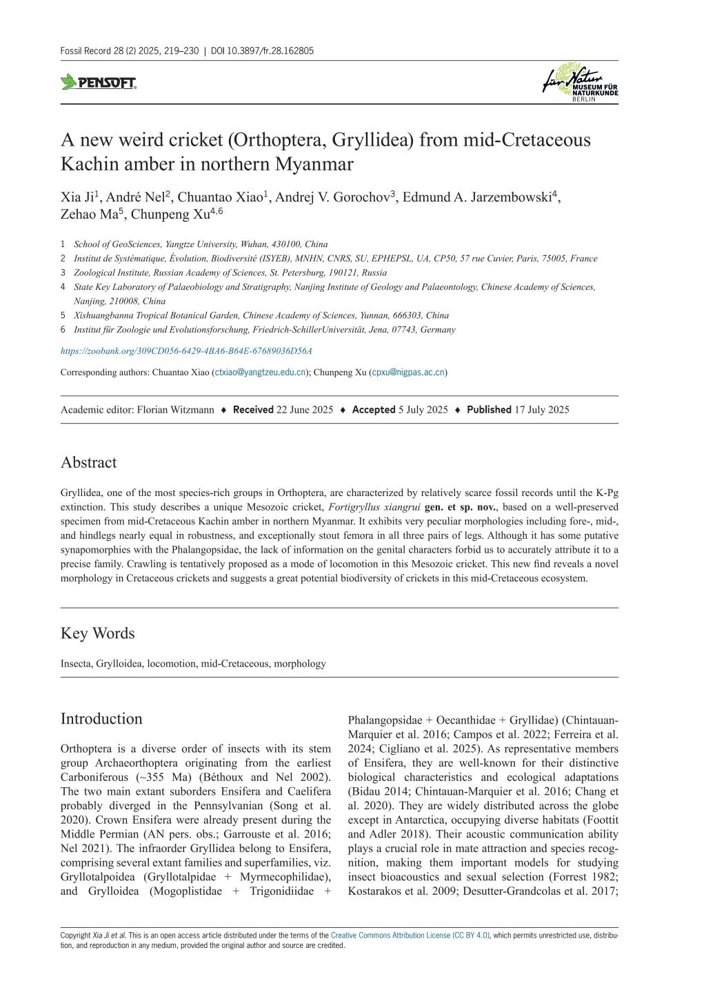 论文信息:Ji, X., Nel, A., Xiao, C.T. et al., 2025. A new weird cricket (Orthoptera, Gryllidea) from mid-Cretaceous Kachin amber in northern Myanmar. Fossil Record, 28(2), 219-230.doi:10.3897/fr.28.16280