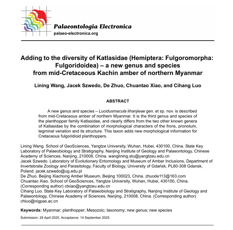 地质资源与地质工程专业硕士研究生王力宁同学在地球科学与古生物学领域期刊《Palaeontologia Electronica》上发表题为“Adding to the diversity of Katlasidae (Hemiptera: Fulgoromorpha: Fulgoridoidea) – a new genus and species from mid-Cretaceous Kachin amber of northern”的研究论文,金碧娱乐场