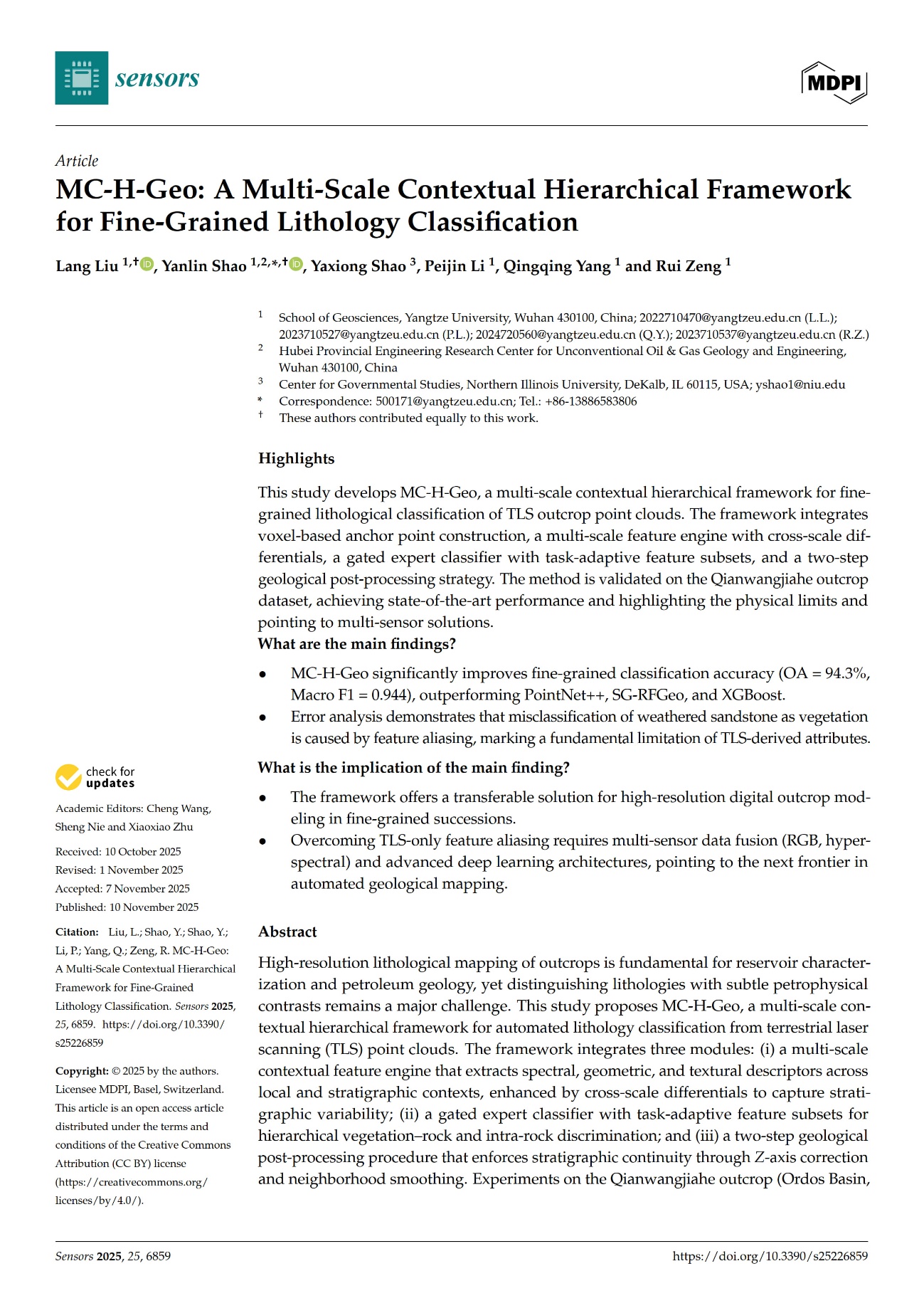 邵燕林副教授团队长期从事数字露头、储层三维表征等方面的研究,团队硕士生刘浪在遥感领域期刊《Sensors》上发表题为“MC-H-Geo: A Multi-Scale Contextual Hierarchical Framework for Fine-Grained Lithology Classification”的研究论文。金碧娱乐场